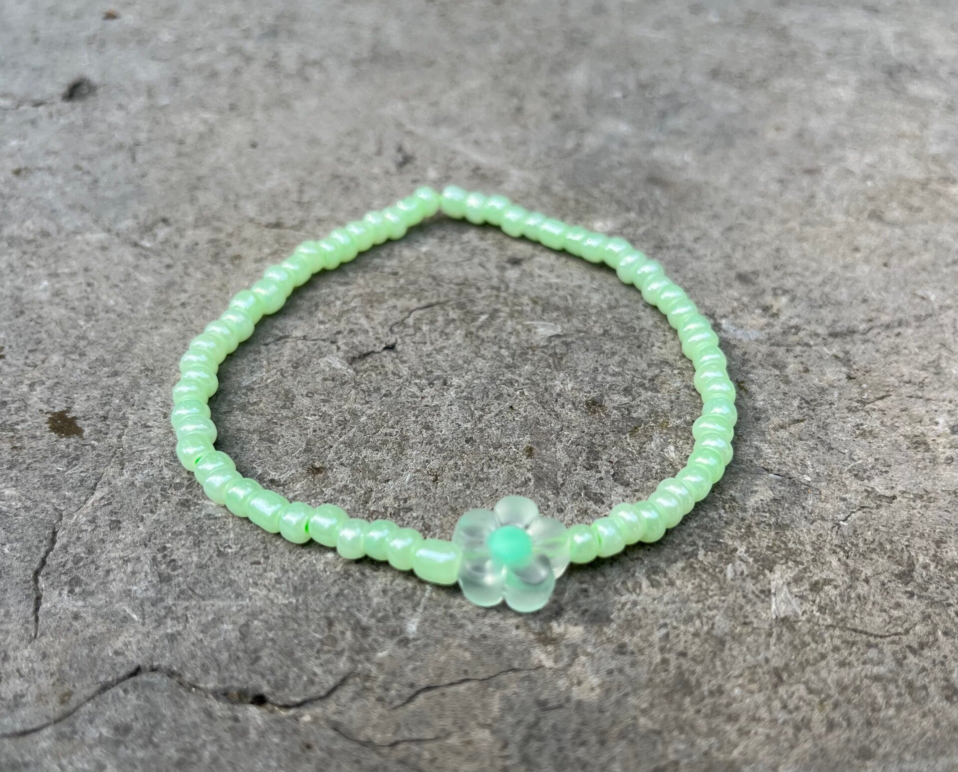 Armbandje met groene kralen en bloempje