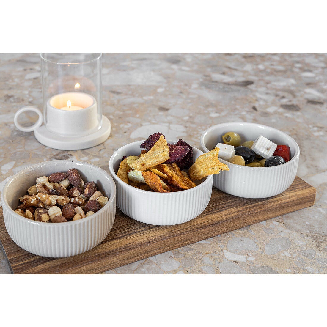 Dit serveerplankje met drie schaaltjes is perfect voor bij het borrelen. Serveer je favoriete dipsausjes, zelfgemaakte kruidenboter of andere lekkere snacks in de bakjes. De serveerplank is gemaakt van acaciahout en de schaaltjes van keramiek. Door de inkepingen in de serveerplank schuiven de bakjes niet van de plank af. De bakjes hebben natuurlijke tinten, waardoor deze bij ieder servies passen.